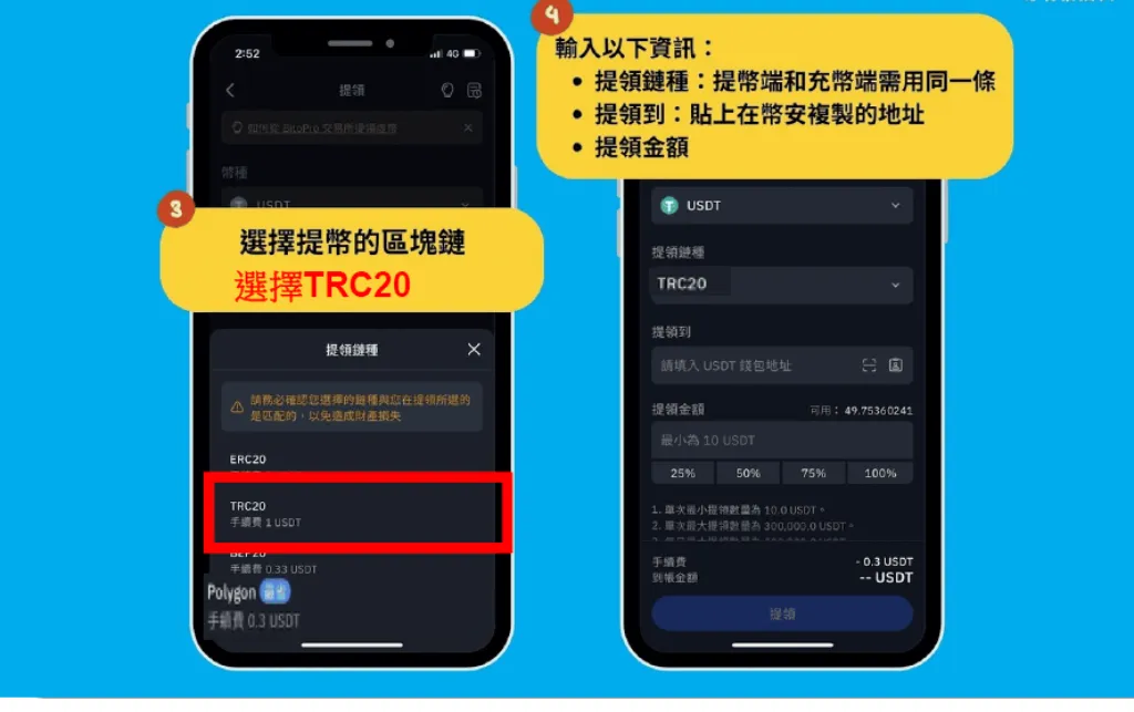選擇提領USDT的協議TRC20,這個欄位要和步驟一填寫的協議相同,手續費為 1.5USDT,接著貼上步驟一複製的錢包地址,提領金額為步驟一系統所提供的數字再加上手續費1.5。