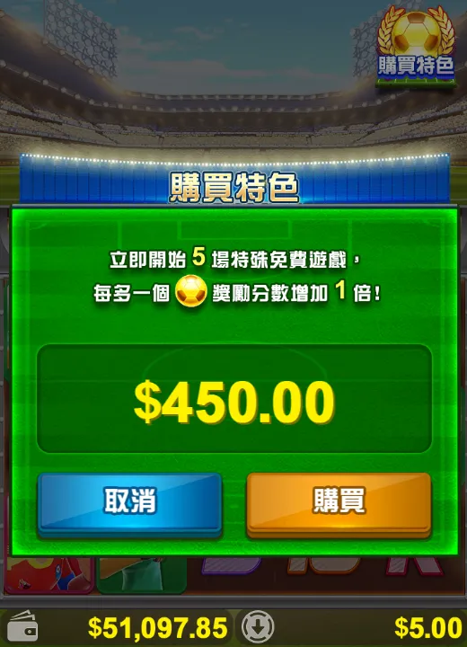 世界盃足球熱後出現的足球風格老虎機,共有243條支付線,能夠直購免費遊戲!免費遊戲中出現金球的話還能多增加免費遊戲次數,採用經典的3*5轉軸,最高倍數達15000倍,忘不了世界盃的火熱夜晚嗎?趕快來體驗這一款足球老虎機!